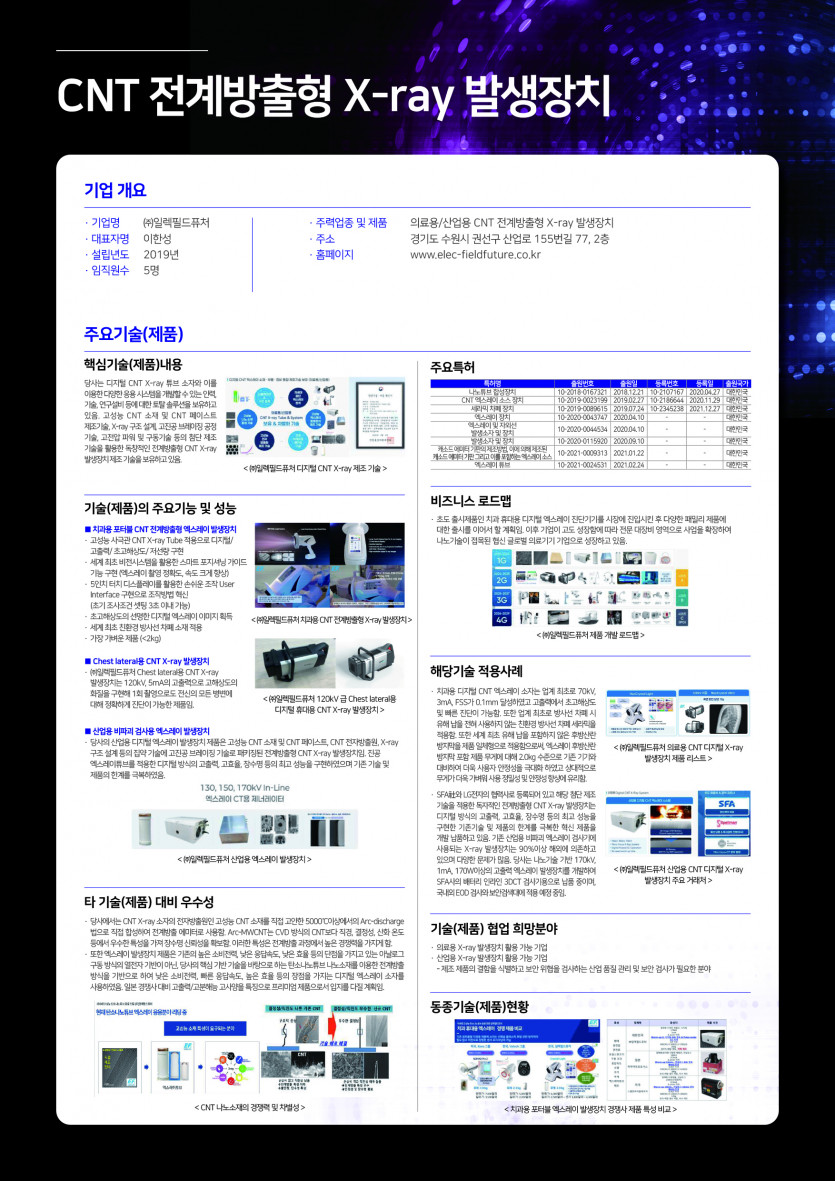 간략설명고성능 CNT 소재 및 CNT 페이스트 제조기술, X-ray 구조 설계, 고진공 브레이징 공정 기술, 고전압 파워 및 구동기술 등의 첨단 제조 기술을 활용한 독창적인 전계방출형 CNT X-ray 발생장치 제조